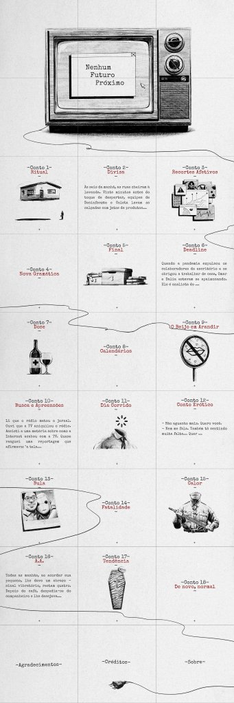 Nenhum futuro próximo é um projeto literário que imagina como vai ser a vida entre o pós-pandemia e sabe-se lá o que vier depois. São dezoito contos curtos sobre a extinção do beijo, a liberação das pistolas-termômetros, o cardápio de drinks com doses de vacina e outros cenários de um mundo que pode até parecer novo, mas que não tem nada de normal. Nem mesmo o formato do livro é normal: Nenhum futuro próximo é um livro no Instagram. Não confunda: não é um e-book. É um livro criado para ser lido integralmente na rede social — até porque já estão dizendo que livro de papel é muito velho-normal… Com previsões cínicas, ácidas e divertidas, o livro foi escrito por Vinícius Neves Mariano e traz as ilustrações de Thiago Miranda. Leia, curta e compartilhe antes que mais alguém preveja o fim do mundo e acabe acertando.